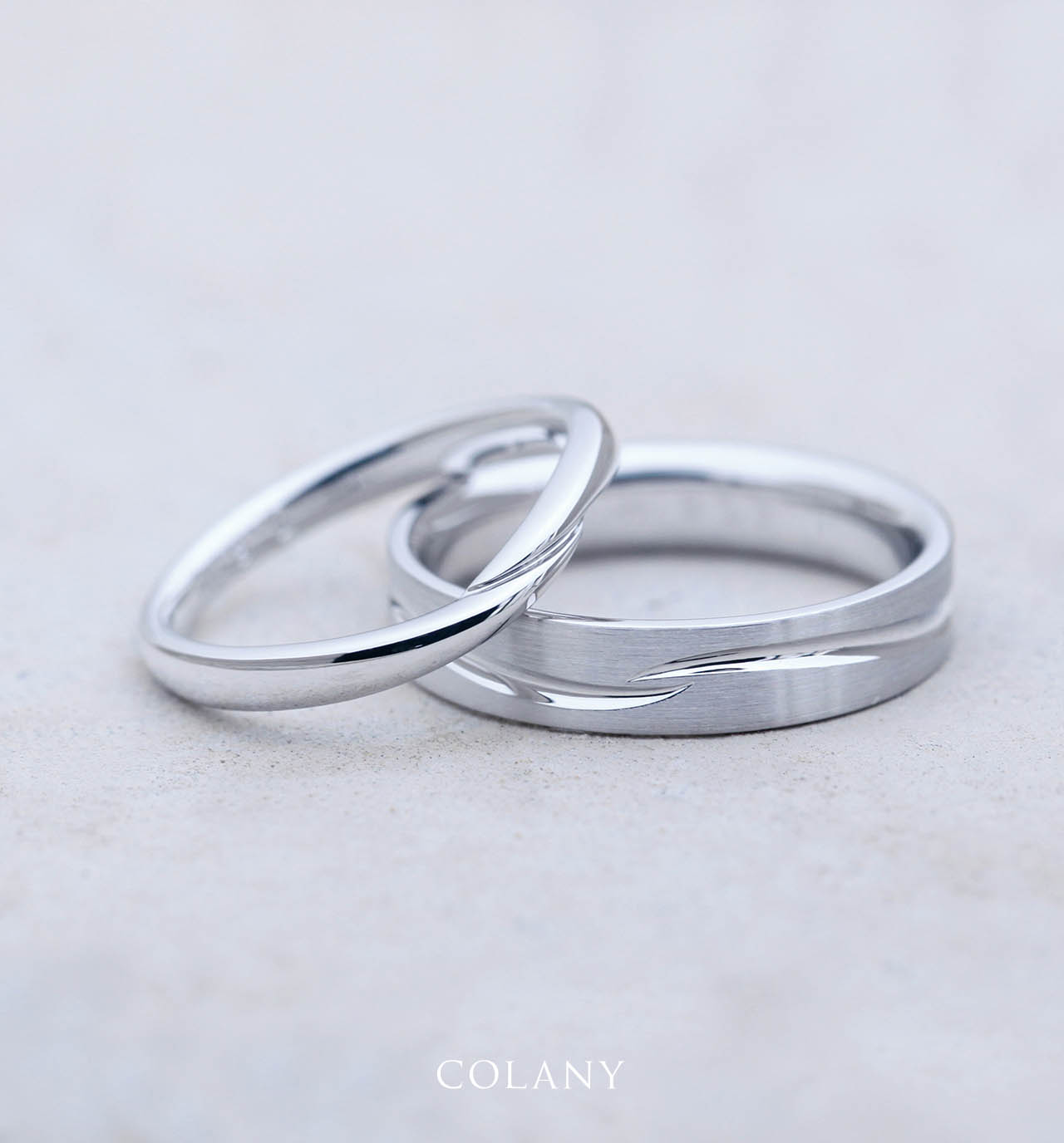 レディースは、手と手を取り合うかのようなツルをデザイン。そのレディースのフォルムをそのまま、メンズの平打ちのリングに刻み込みました。そのため、ペアであることがひと目で分かり、それぞれのもつ女性らしさ、男性らしさをアピールしながらもセット感の高いリングです。